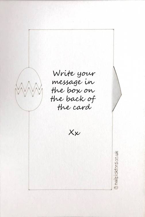 150x100mm (6x4") white card with a cracking Easter Egg cut design showing multi-coloured harlequin pattern printed inside.