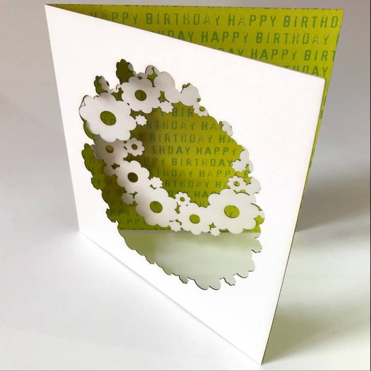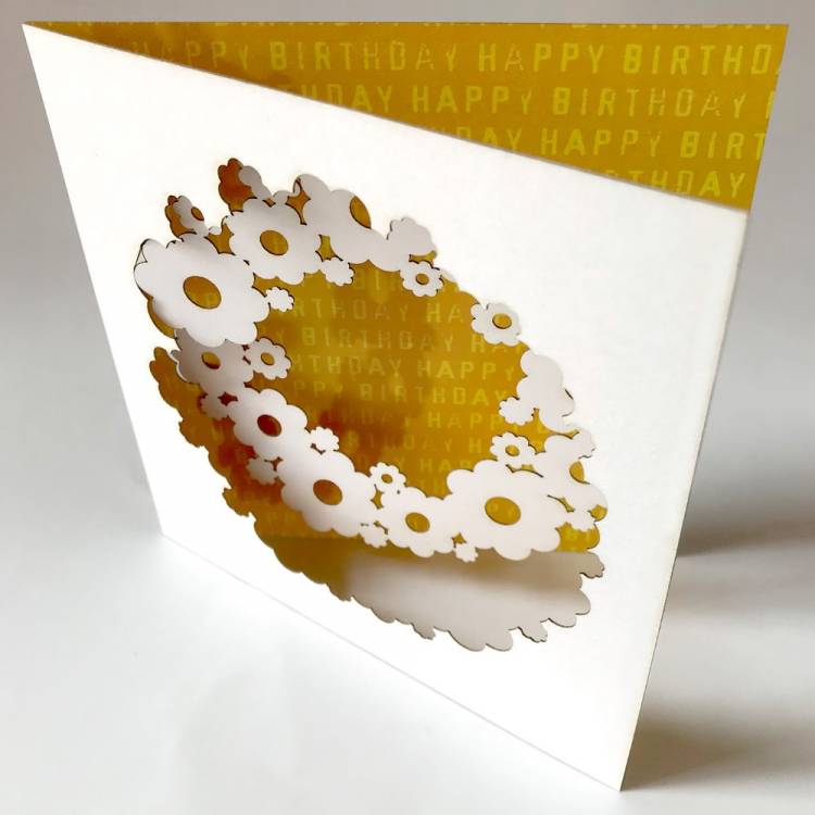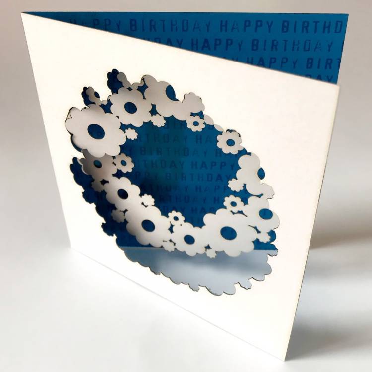 125mm (5") square white card with Daisy Chain cut design showing Happy Birthday pattern printed inside - choose from 4 different colours.