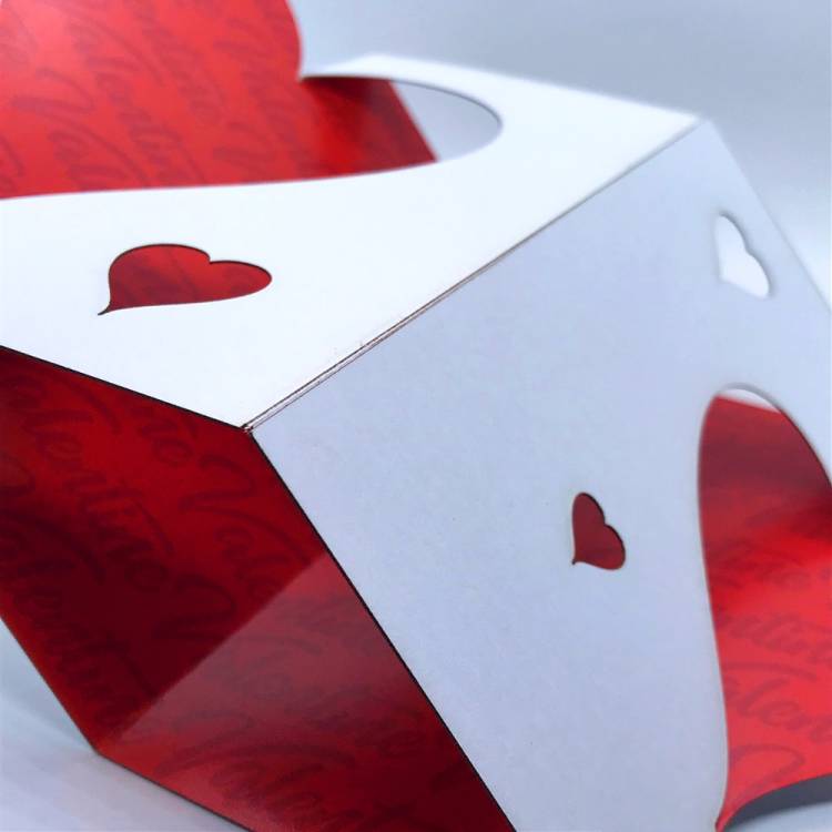 125mm (5") square white card with heart cut design showing red Valentine pattern printed inside.