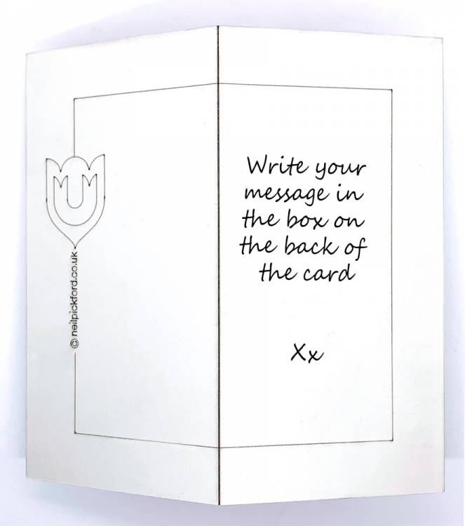 Card opens from flat into a box rather than the conventional edge fold • see video • Rather than the inside, you should write your message on the back of the card - in the box provided