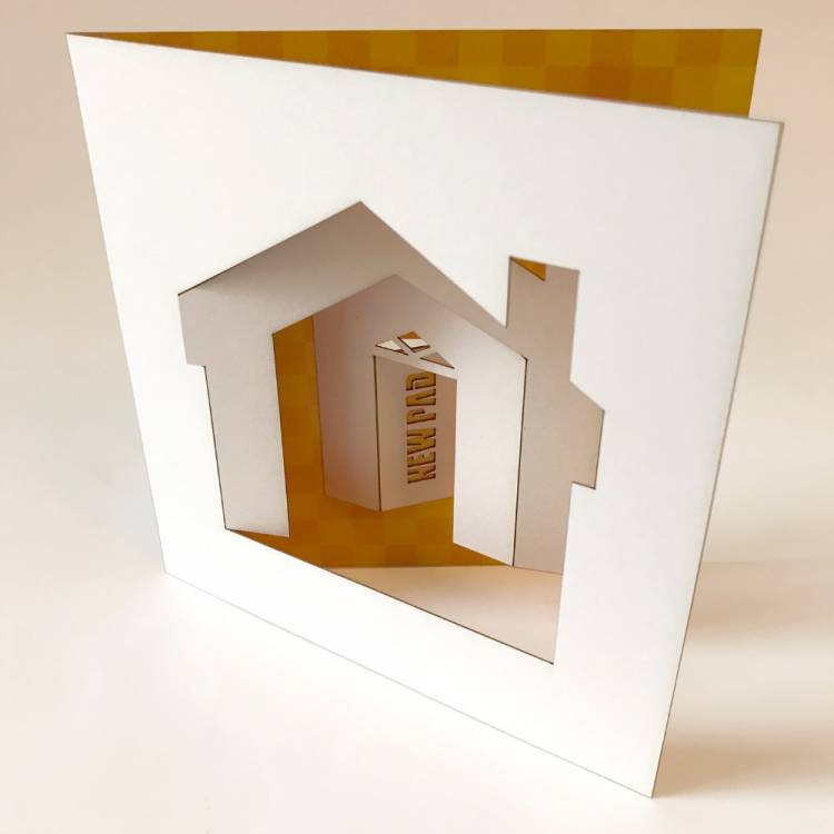 125mm (5") square white card with House cut design showing coloured tiles pattern printed inside - choose from 4 different colours.