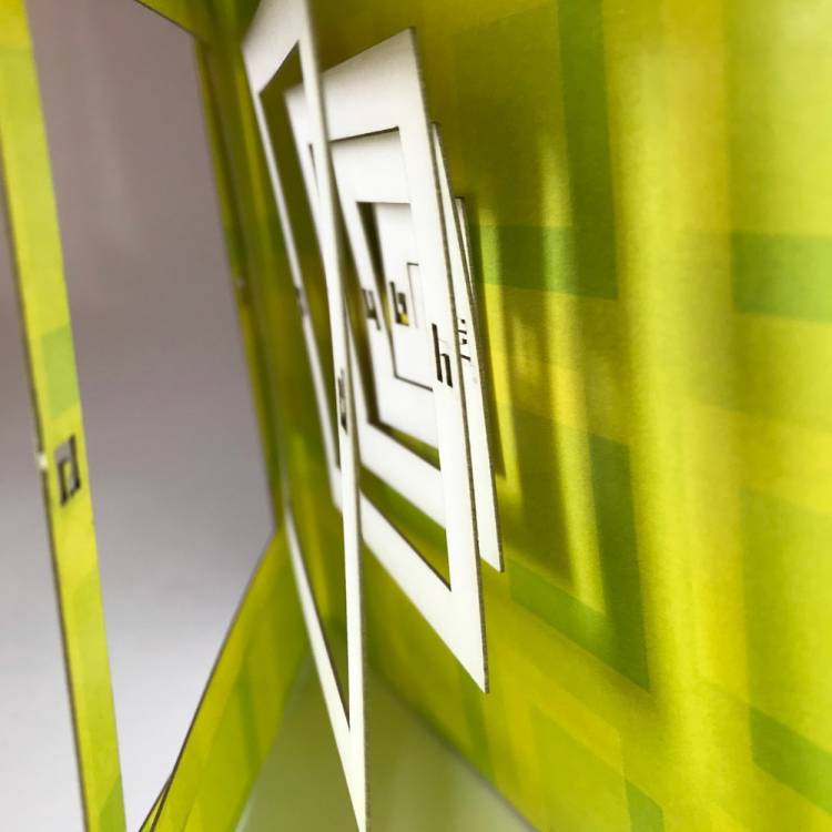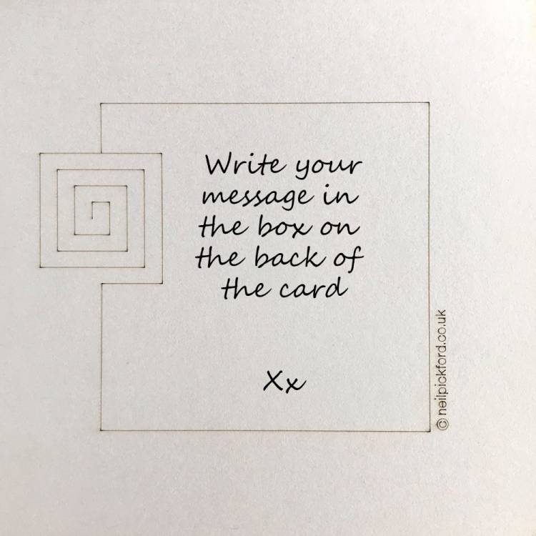 125mm (5") square white card with square spiral cut design showing off-set square pattern printed inside - with a choice of four colours