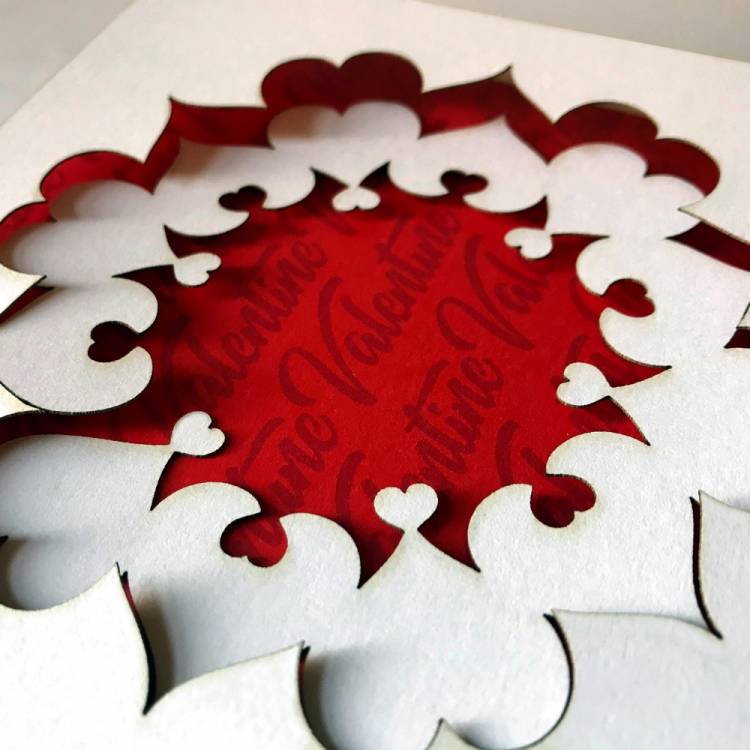 125mm (5") square white card with heart chain cut design showing red Valentine pattern printed inside.