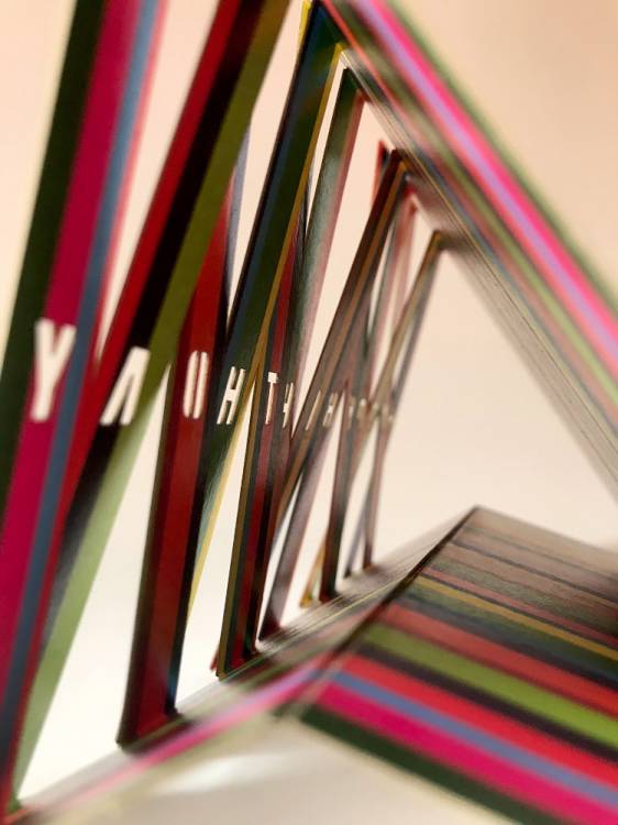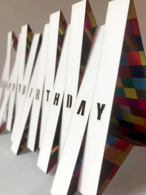 A very avant garde card which opens from flat into a triangle rather than the conventional edge fold • see video • Rather than the inside, you should write your message on the back of the card - in the box provided