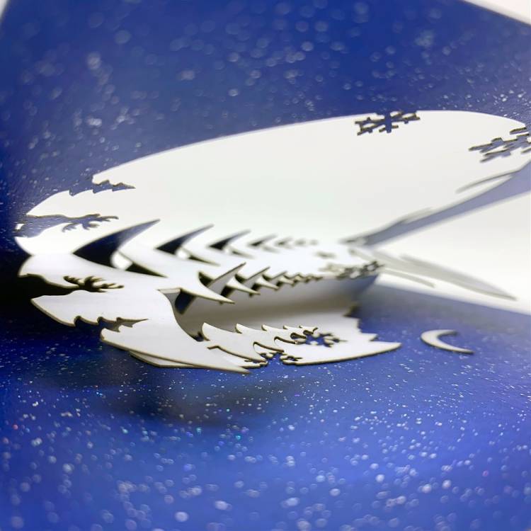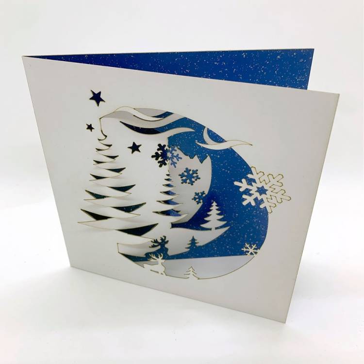 125mm (5") square white card with Winter's Night cut design showing blue pearlescent sparkle card inside.