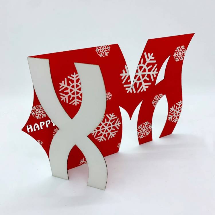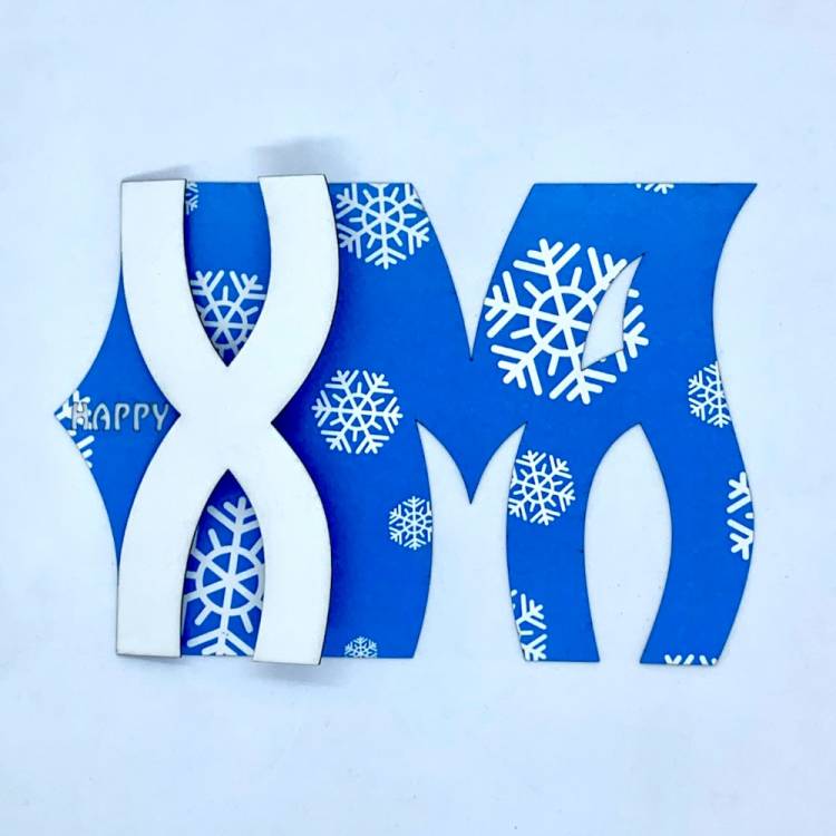 150x100mm (6x4") white card with X-MAS cut design showing snowflake pattern printed inside – on blue, green or red.